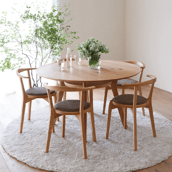 原木餐桌顏色溫潤簡潔,可透過選用同品牌同款式的餐椅,搭配多色椅墊,可以讓空間風格更活潑。