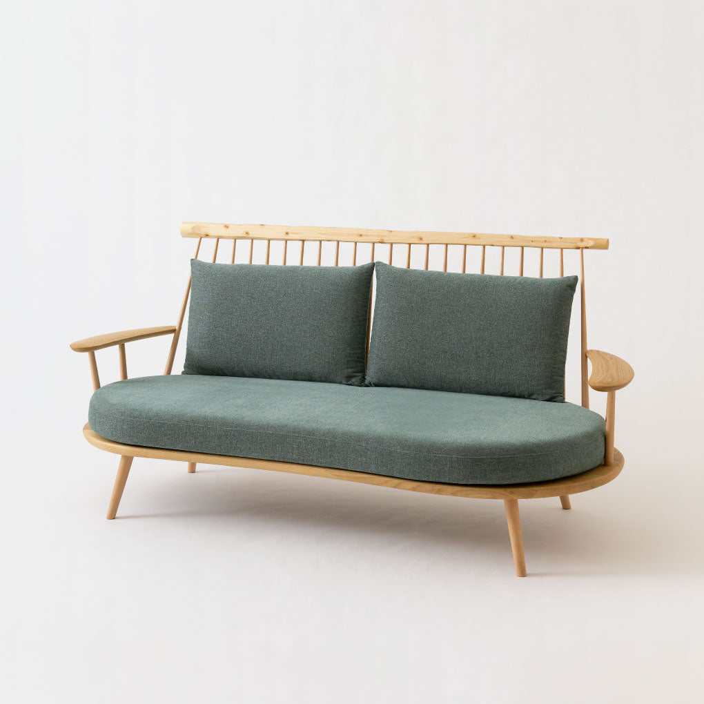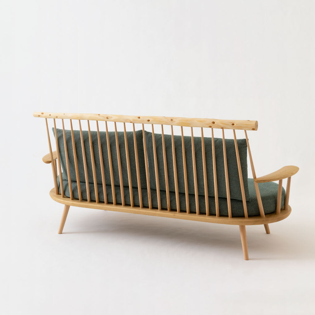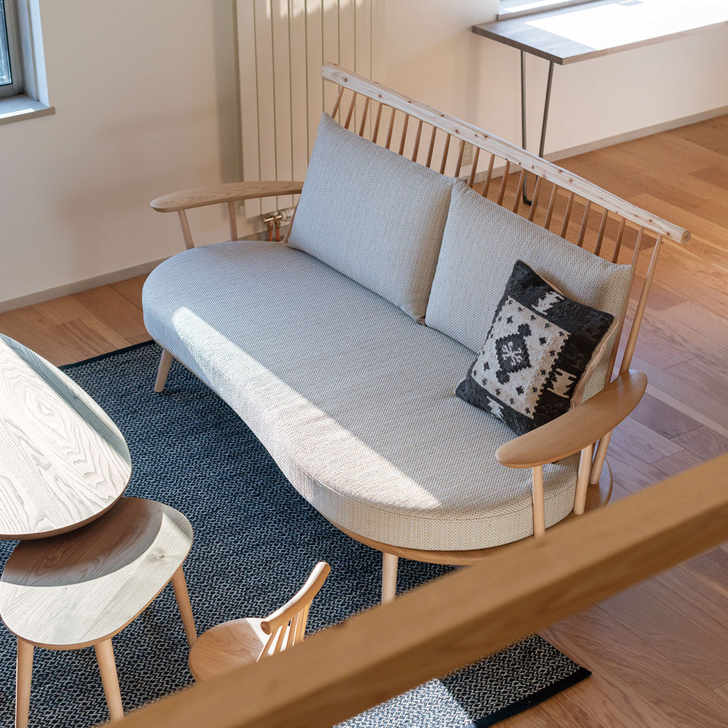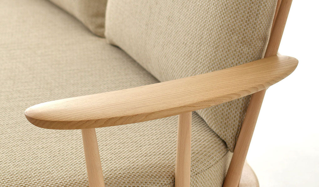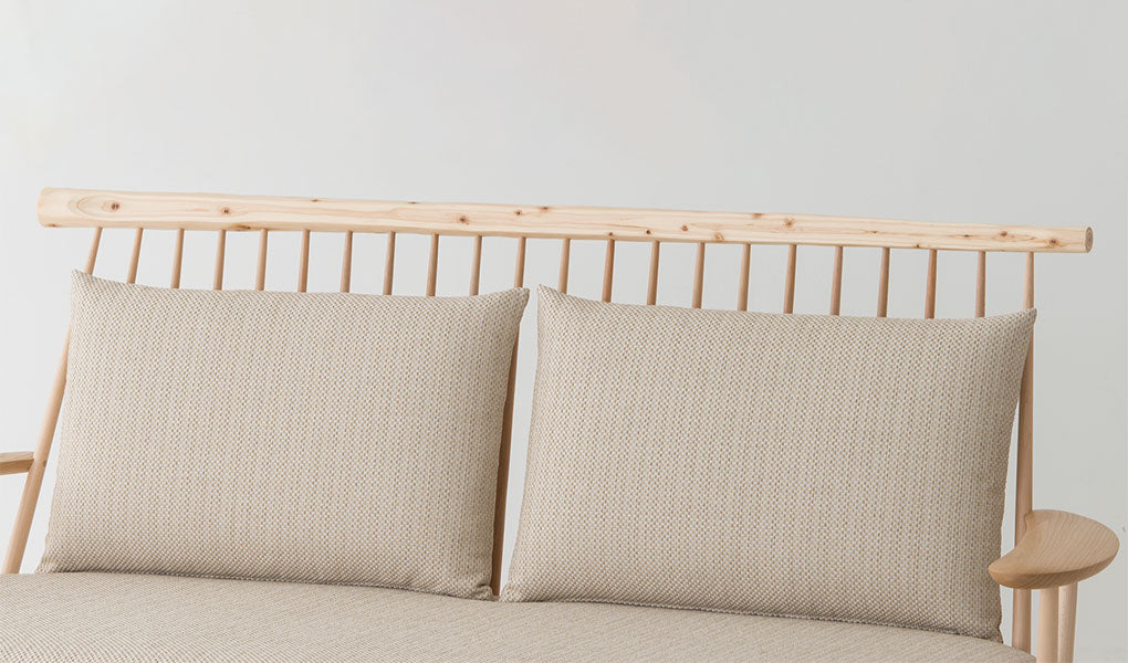 Kinoe 系列特別之處在椅子、沙發椅背的頂部笠木,使用自然枝條,也是HIDA 「與森同行」理念的國產材專案之一。