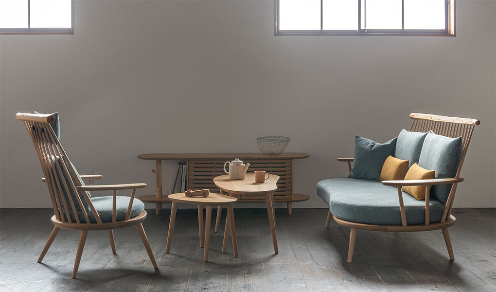 Kinoe 系列特別之處在椅子、沙發椅背的頂部笠木,使用自然枝條,也是HIDA 「與森同行」理念的國產材專案之一。