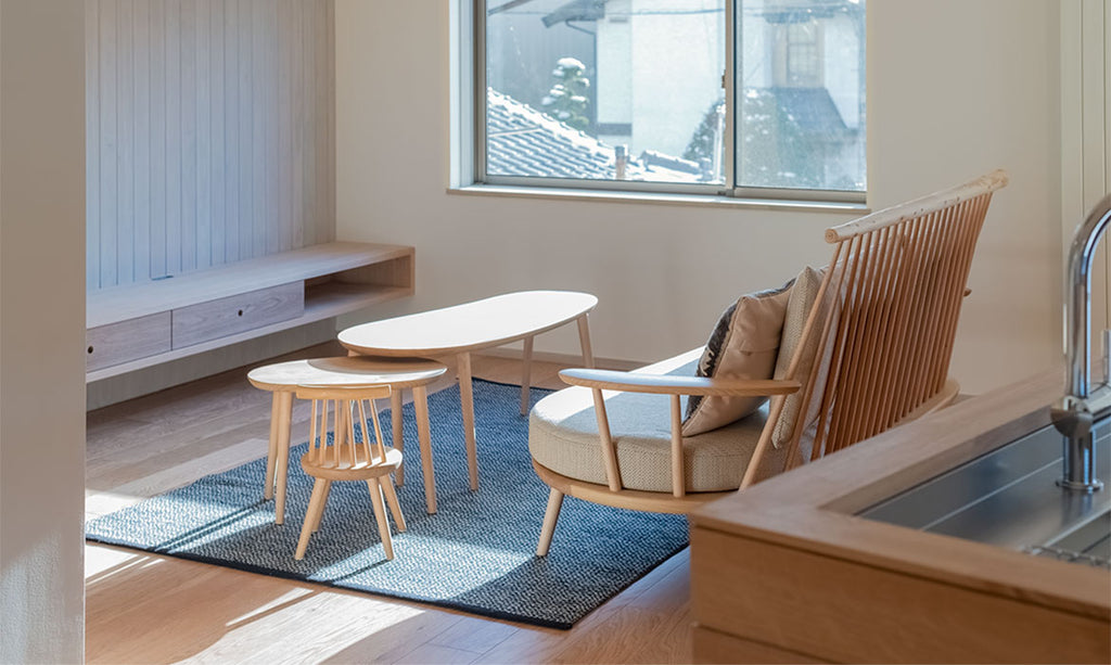 這是Kinoe系列,來自日本百年品牌 HIDA Sangyo 發揮樹枝之美的一系列設計家具。從餐椅、餐桌,到電視櫃、沙發、兒童椅子等,延伸出一體的自然語彙,讓光影落在家具上時,便像樹梢在室內舒展。