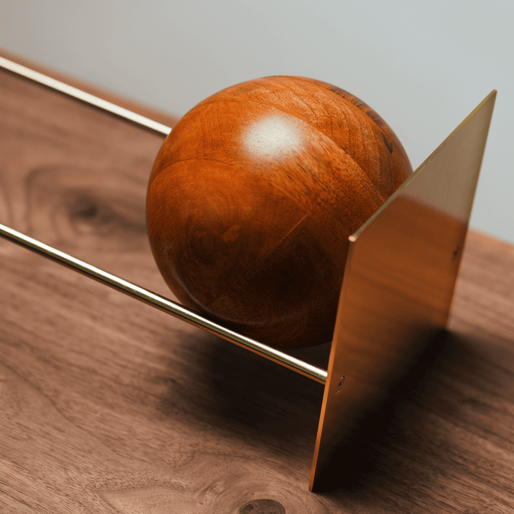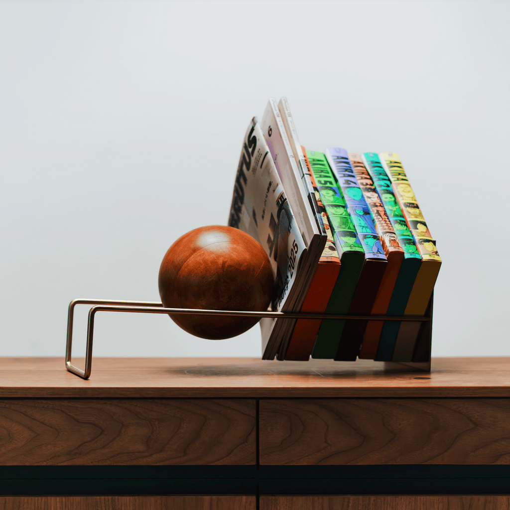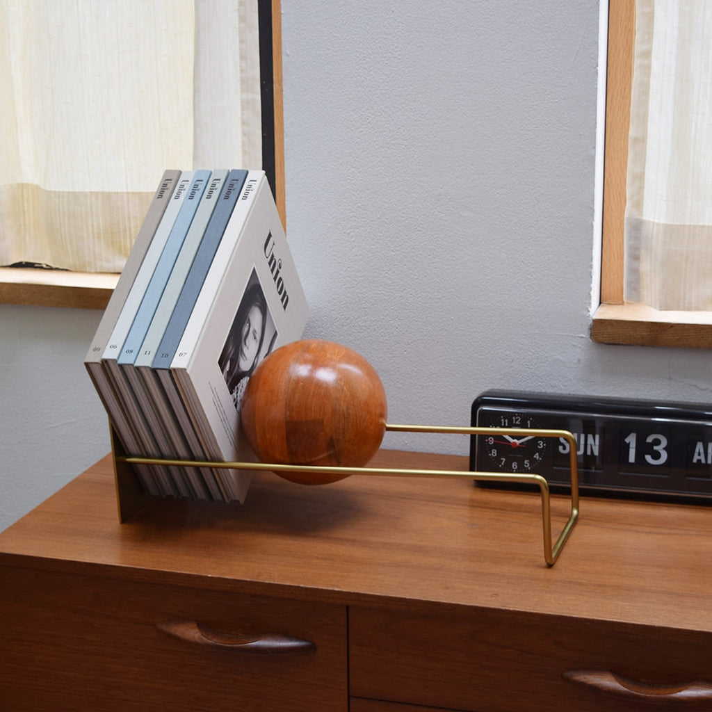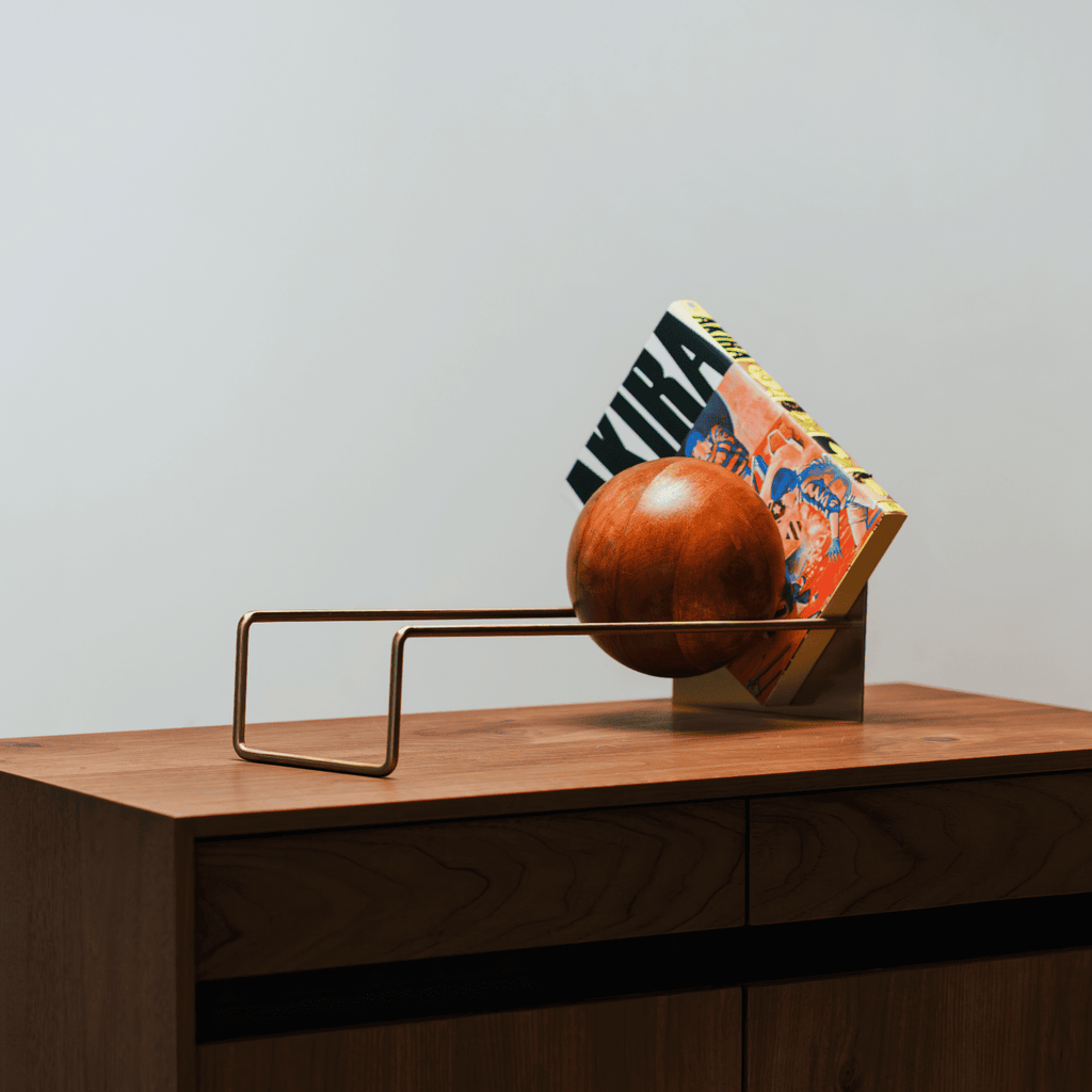 以極簡結構設計與力學融合,實木木球沿著斜坡徐徐向下滾動,將書籍、唱片、雜誌、漫畫等固定。它不僅是收納功能,更可隨著日常心情,改變陳列及裝飾的生活單品。
